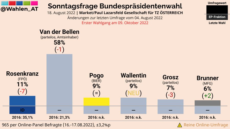August 2022 Wolfgang Ottowitz Parteilos Hubert Thurnhofer Parteilos Dominik Wlazny Marco Pogo Bierpartei Rudolf Remigius Kleinschnitz Parteilos Martin Wabl Parteilos Thomas. Die österreichische Bundespräsidentenwahl 2016 kurz BPW 2016 im Amtsgebrauch auch BPW 16 war die 13. Oktober 2022 gehen die Österreicherinnen und Österreicher zur Präsidentschaftswahl an die Urnen.